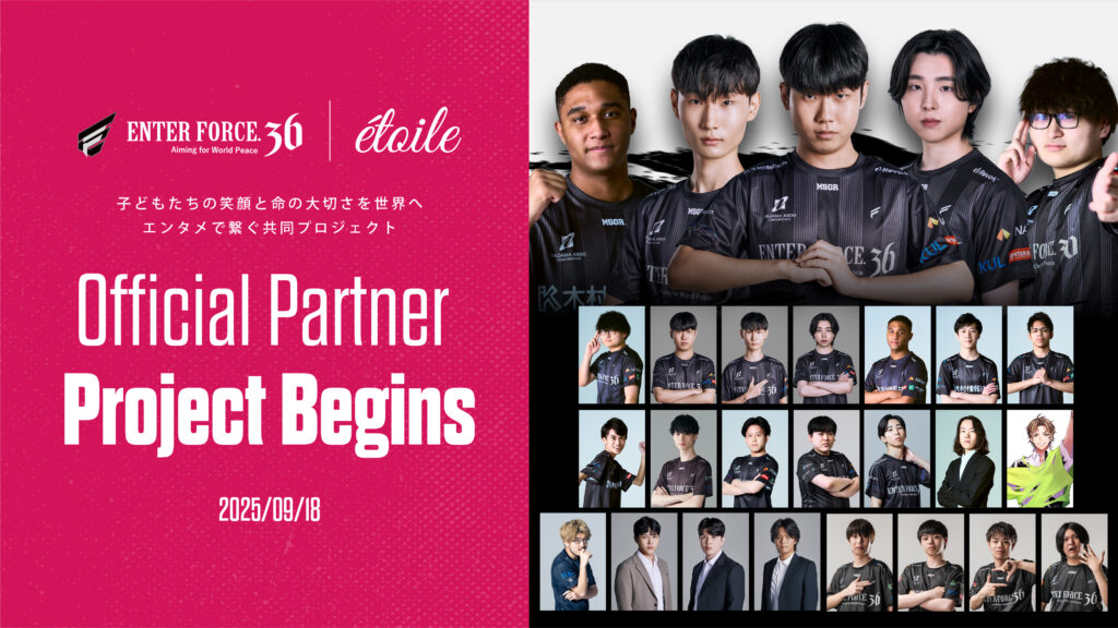 プロeスポーツチーム「ENTER FORCE.36(E36)」は、テクノロジーとアートを融合させた SKY ENTERTAINMENT を手掛ける空の表現者集団「étoile」と、「子どもたちの幸せ、笑顔、そして命の大切 … 続きを読む E36 × étoile SKY ENTERTAINMENTで子どもたちの笑顔と命の大切さを世界へ ― 共同プロジェクトを立ち上げ、パートナーシップをスタート ―